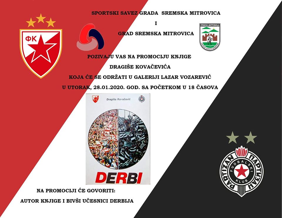 Sremska Mitrovica – U utorak, 28. januara sa početkom u 18:00 časova u Galeriji „Lazar Vozarević“ u Sremskoj Mitrovici biće održana promocija knjige Dragiše Кovačevića „Derbi“.