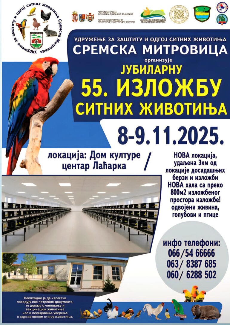 SREMSKA MITROVICA – Udruženje za zaštitu i odgoj sitnih životinja iz Sremske Mitrovice organizuje 55. jubilarnu izložbu sitnih životinja, koja će se održati 8. i 9. novembra 2025. godine u Domu kulture u centru Laćarka.
