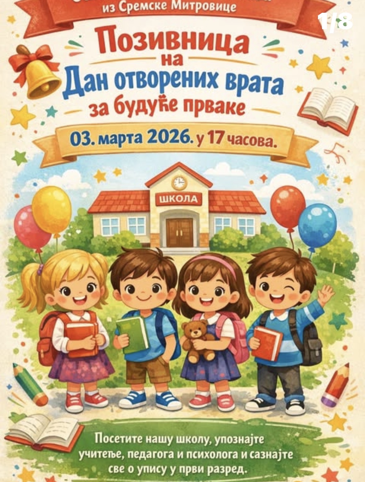 Sremska Mitrovica – Osnovna škola „Sveti Sava“ u Sremskoj Mitrovici organizuje Dan otvorenih vrata namenjen budućim prvacima i njihovim roditeljima, sa ciljem da se deca i porodice na vreme upoznaju sa radom škole i uslovima u kojima će započeti svoje školovanje.