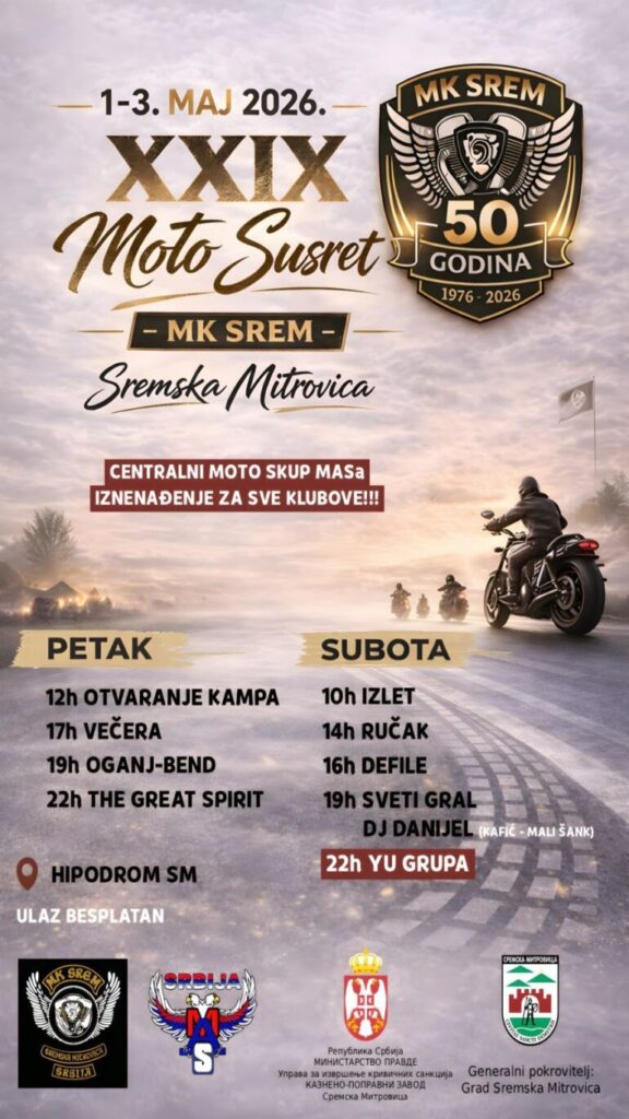 SREMSKA MITROVICA – Ovogodišnji, XXIX Moto susret u organizaciji MK Srem, biće održan od 1. do 3. maja na prostoru Hipodroma u Sremskoj Mitrovici, uz bogat i raznovrstan program za sve posetioce.