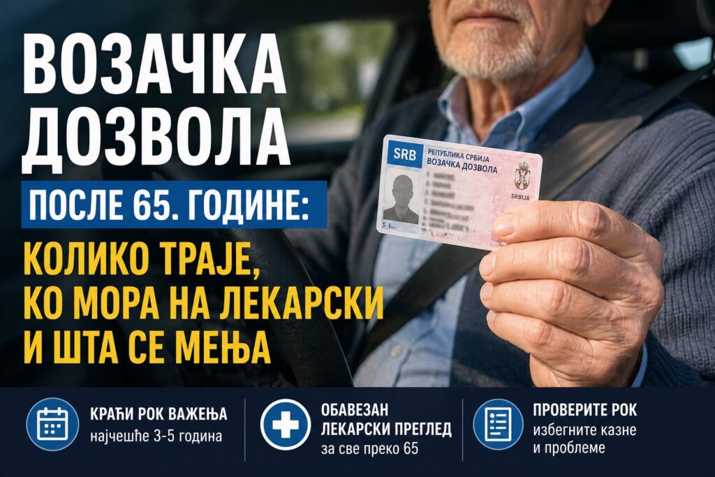 Vozači stariji od 65 godina u Srbiji podležu drugačijim pravilima kada je u pitanju produženje vozačke dozvole. Nakon ove starosne granice, dozvole se izdaju na kraći vremenski period, uz obaveznu proveru zdravstvene sposobnosti.
